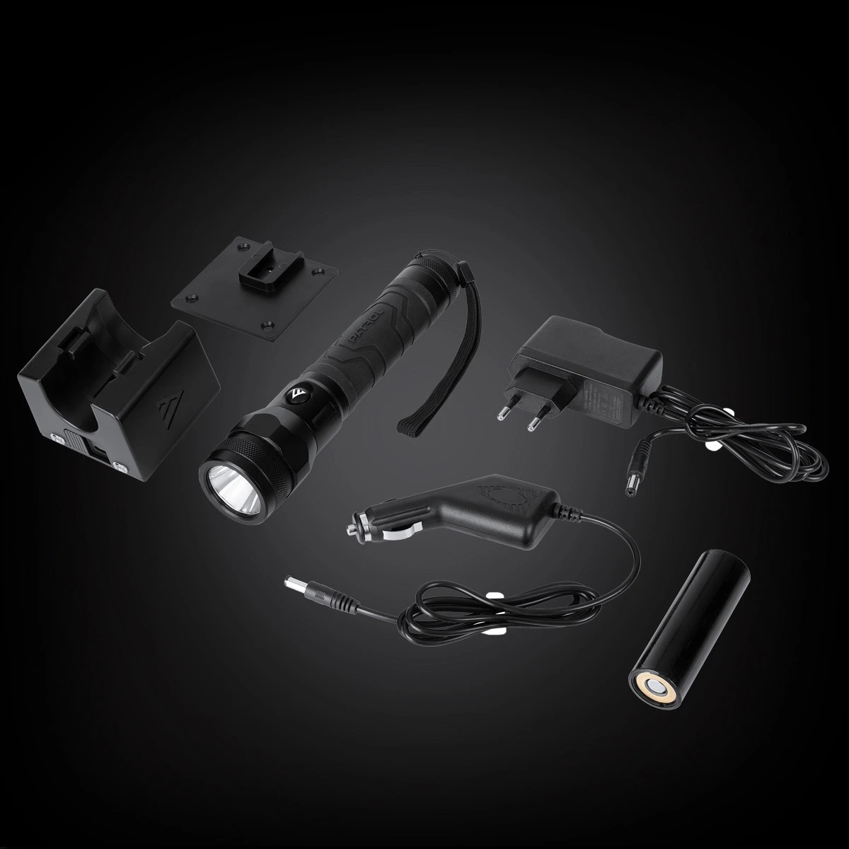 SET UKLJUČUJE: zidnu stanicu za punjenje, 12V DC punjač za automobil, 230V adapter za struju, ručnu traku, Li-Ion bateriju (21700)